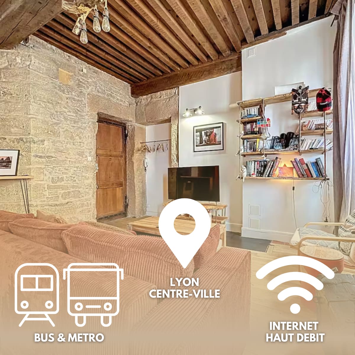 Niché sur la presqu'île en plein centre de Lyon, profitez de cet appartement aux poutres et pierres apparentes entièrement rénové à proximité immédiate de la charmante place sathonay et à quelques pas de la place des terreaux. Idéal pour celles et ceux qui souhaitent explorer à pieds les principaux sites touristiques, les restaurants, les pubs, sortie culturels, nocturnes de Lyon que vous soyez en famille, entre amis ou professionnels.
