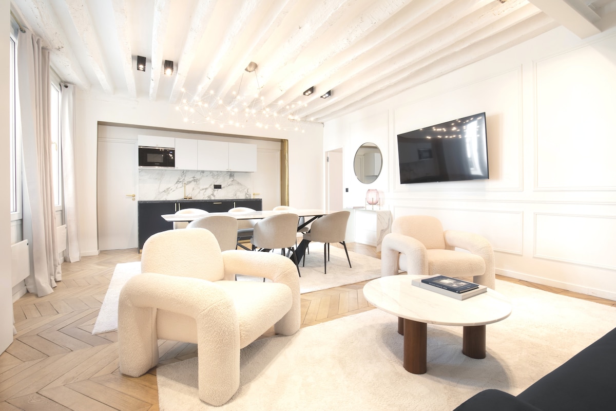 60 m2 luftkonditionerad lägenhet med exklusiv inredning i hjärtat av Paris historiska stadsdel Montorgueil, känd för sina delikatessbutiker, små bistroer och restauranger. Lägenheten ligger på 1 :a våningen i en byggnad på en mycket lugn gata. Den renoverades 2023 av en känd arkitekt och är därförsedd med utrustning av mycket hög standard. Du kommer att känna dig som i en hotellsvit med extra charm, en riktig parisisk bostad.