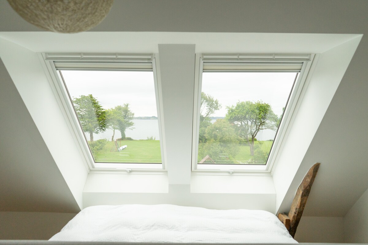 Ro, hav, sjæl og charme lige ved Flensborg Fjord. Med ny sauna og 70 kvm terrasse - begge med havudsigt. 6 gæster har adgang til: Flot køkken og bad, stor stue med TV og internet og unik havudsigt. 3 store soveværelser og alle med den smukkeste udsigt over fjorden. Gendarmstien/Gendarmenwanderweg og fantastisk natur som nabo, tæt på Flensborg og Sønderborg og gåafstand til restauranterne Pearl, Sivgaarden og Providence. Døre er udsmykket med landskabsmotiver af kunstneren Wilhelm Dreesen.