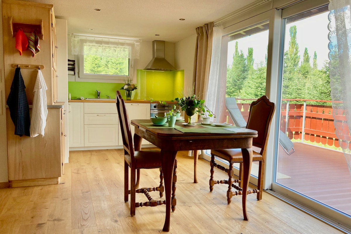Den mysiga och okomplicerade lägenheten ligger i ett äkta schweiziskt "Stöckli" med modern värme och badrum mitt i naturen. Du tillbringar din semester på en före detta bondgård med eget källvatten och självhushållsträdgård. Du kan köpa ägg, grönsaker, salami och ost. Ett litet paradis och perfekt tillflyktsort för vuxna och barn. Det finns en stor trädgård med ängar. Föräldrar bör hålla ett öga på sina barn eftersom de är motiverade att starta äventyr