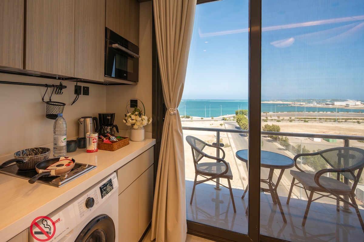 Njut av en bekväm vistelse med panoramavy över horisonten och den vidsträckta himlen i en elegant svit med ett sovrum och ett rymligt, bekvämt vardagsrum med en stor skärm, en lugn atmosfär och fullständig avskildhet – perfekt för två personer att koppla av och glömma bekymren om renlighet. Utvald plats Parkering Yta: 75 meter 65" smart-TV med prenumerationer Netflix – Shahid – YouTube Tvättmaskin Personliga hygienkit och handdukar för användning Inköp av ljud- och ljusisolerande elfönster madrass av en medicinsk säng tillsammans för filt Bekväm soffa Nära till alla tjänster Flygplats: 15 minuter – Al Yasmeen Mall: 5 minuter – Corniche: 20 minuter