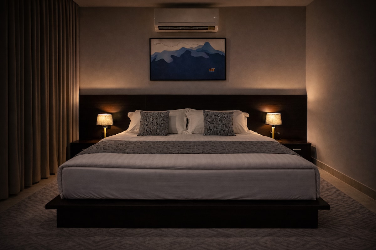 Välkommen till detta eleganta och lyxiga rum som kombinerar elegans och komfort i varje hörn och erbjuder en perfekt vistelse för en natt eller för en längre vistelse, en bekväm dubbelsäng med ljus under sängen som ger en touch av värme och skönhet ett stort fönster som ger bra naturligt ljus, en smart och stor TV, en Split luftkonditionering Rummet är utformat i en lugn och bekväm stil, med beige och guld färger och varma trädetaljer, belysningen är noggrant genomtänkt för att passa olika tider: en ljus morgon eller en lugn kväll, lämplig för par, ensamma resenärer eller till och med affärsresenärer.