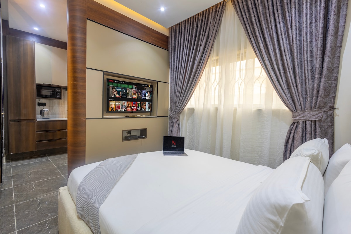 Upptäck lyxigt boende i Abujas mest exklusiva distrikt. Denna lägenhet med 1 sovrum erbjuder el dygnet runt, snabbt WiFi och säkerhet dygnet runt i en lugn och privat miljö perfekt för affärsresenärer eller par som söker komfort och bekvämlighet. Mitt i hjärtat av Abuja ligger du bara några minuter från ambassader, förstklassiga restauranger, köpcentra och viktiga affärscentra, vilket gör det perfekt för kortare eller längre vistelser. Njut av en lugn miljö utformad för en stressfri upplevelse.