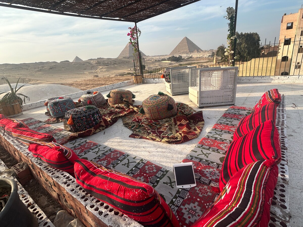 Välkommen till din privata tillflyktsort på taket i hjärtat av Giza! Denna charmiga studio ligger på en rymlig takterrass och erbjuder fantastisk utsikt över pyramiderna - perfekt för soluppgångskaffe, solnedgång lounging i hängmattan, eller blötlägga i din egen jacuzzi under stjärnorna. Fullt utrustat kök Bekväm att sova och koppla av Egen ingång för din lugn och avskildhet Oavsett om du är här för äventyr eller avkoppling erbjuder denna studio den perfekta blandningen av komfort och oförglömlig utsikt.