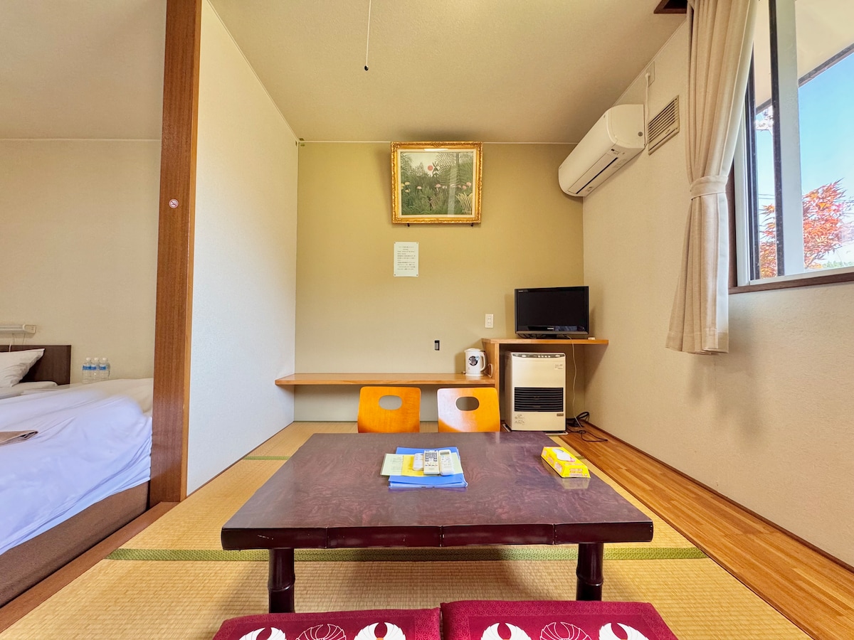 Njut av en lugn vistelse i vårt Western Tatami Family Ensuite Room, komplett med ett privat bad i japansk stil. Vakna upp till lugn utsikt över Mt. Usuzan och de omgivande öppna fälten. Rummet har en plysch dubbelsäng, stora fönster och moderna bekvämligheter inklusive Wi-Fi och luftkonditionering. Perfekt för par eller ensamresenärer som söker lugn och en nära anknytning till naturen.
