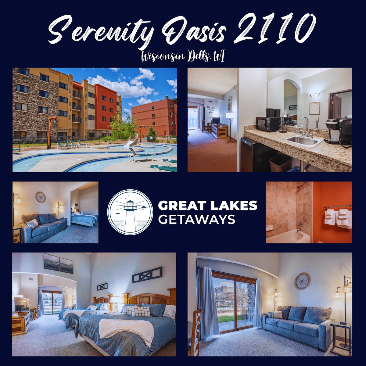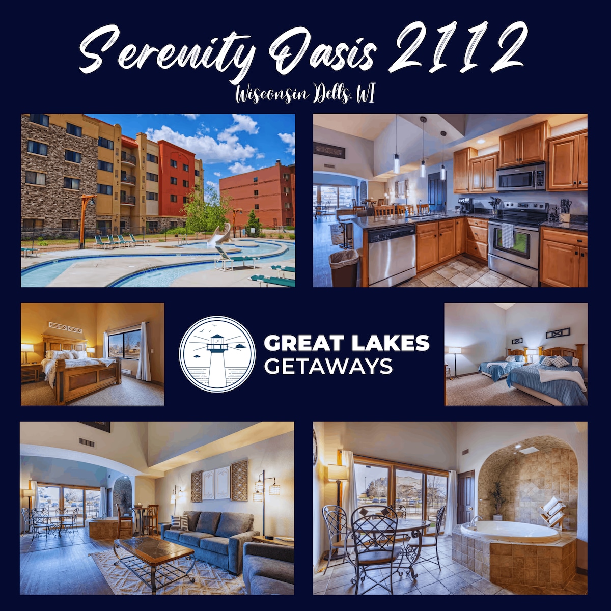 *** VATTENPARKSPASS INGÅR Lägenheten rymmer 8 personer bekvämt. 10 gäster är tillåtna enligt brandskyddsriktlinjer, sovarrangemang kommer inte att tillhandahållas för de sista 2 av 10 gäster, ta med din egen uppblåsbara madrass, sovsäckar etc. Välkommen till din perfekta resa! Denna rymliga lägenhet med 2 sovrum och 2 badrum ligger inbäddat i vackra Wisconsin Dells, vilket erbjuder både komfort och bekvämlighet för din familj eller grupp.
