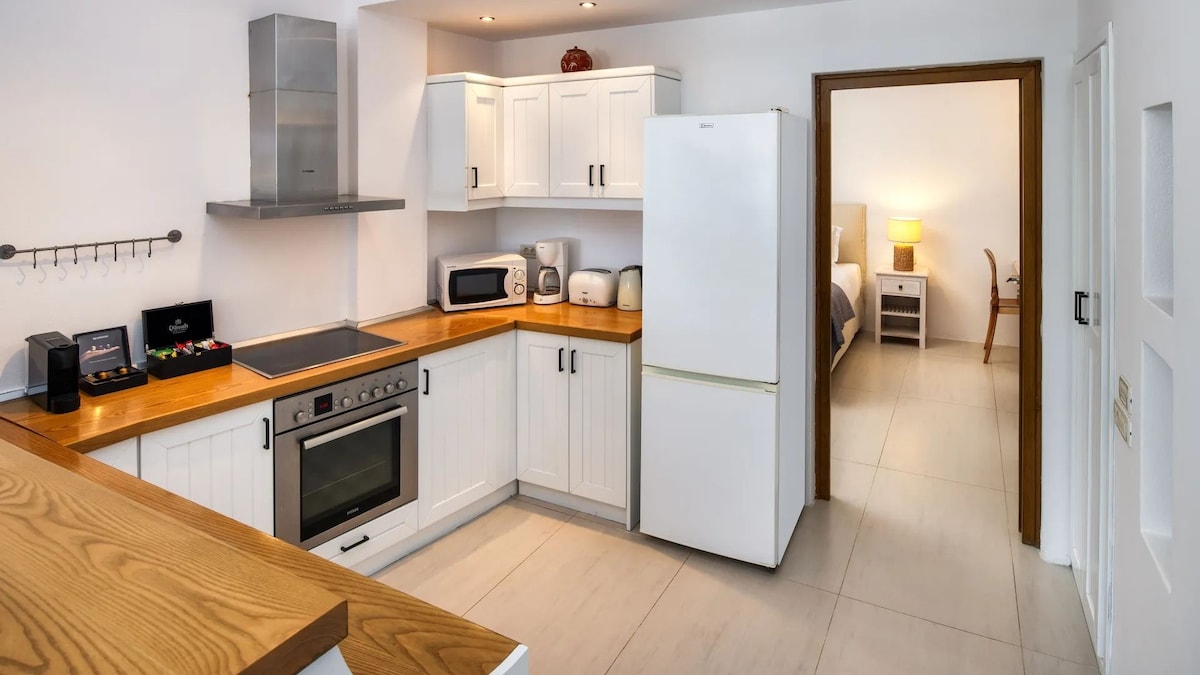 Maisonette lägenhet 75 kvm med egen ingång, innergård och balkong med havsutsikt. Här finns ett rymligt vardagsrum, ett sovrum och två badrum med dusch. Det fullt utrustade köket har spis, ugn, mikro, kyl och alla nödvändiga köksredskap. Bekvämligheterna inkluderar även tvättmaskin, två platt-TV med streamingtjänster, ljudisolering, kaffebryggare och vattenkokare. Lägenheten erbjuder en dubbelsäng och en bäddsoffa.