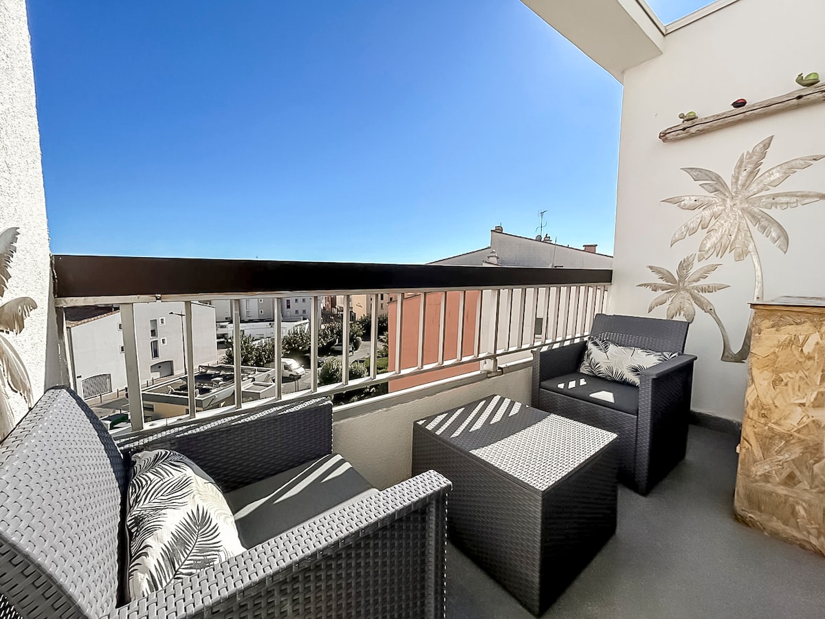 Trevlig lägenhet på 45 m2, 2 rum + mezzanin. Rymlig och ljus, med utsikt över havet, luftkonditionerad, tredje våningen med hiss. Fantastisk panoramavy över havet, Fort Brescou och yttre hamnen, utan insyn. Vardagsrum med stort fönster som vetter mot en söderläge terrass, skyddad från insyn, motoriserad markis och trädgårdsmöbler. Köket och badrummet renoverades 2023. Sovrum med dubbelsäng på 160 cm. Mezzanin på övervåningen med 2 sängar på 90 cm. Gratis säker parkering.