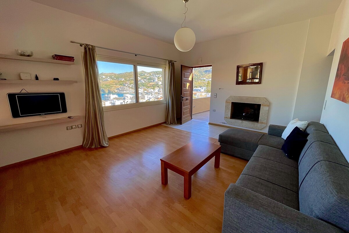 Bekväm lägenhet med två sovrum och fantastisk utsikt. Tillgång till en ensam stenig strand 250 meter framför huset. Också mellan 2 populära stränder (Agia Pelagia & Lygaria, 10 min promenad). .Efter kommunikation och efter 15:00 kan jag hämta dig (gratis) från Heraklions flygplats (om det är tillåtet). Mycket enkel parkering 20 meter bort. Jacuzzin är privat och balkongen runt den. Även privat är balkongen framför köket. Jacuzzin är helt ny och uppvärmd (till 35°).