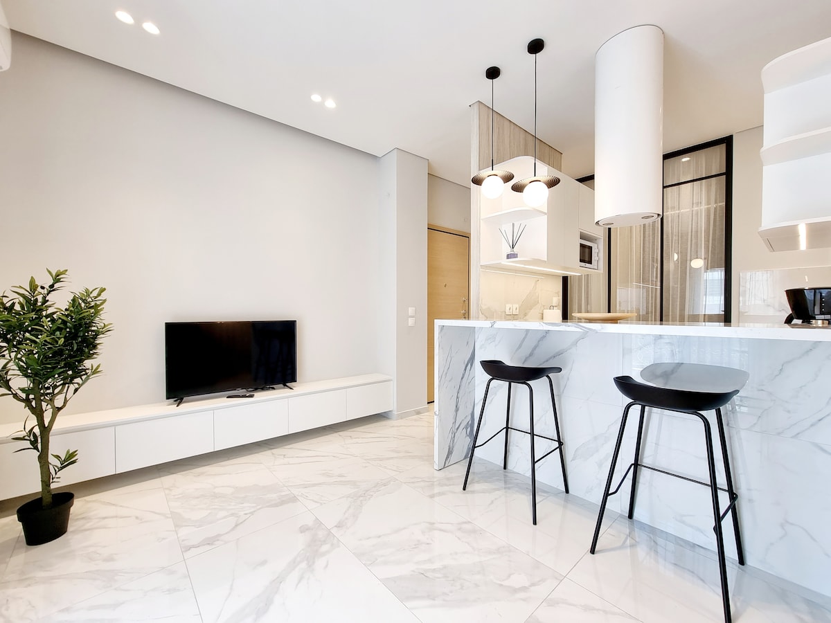 Elegans och enkelhet råder i denna nyrenoverade lägenhet. Utformad för att få ut mesta möjliga av det naturliga ljuset som kommer in i lägenheten, består den av ett öppet kök, ett sovrum med två konventionella och två glasväggar, ett vardagsrum med en bäddsoffa och ett badrum med dusch. Minimalt, skarpt och modernt med gott om förvaringsutrymme, det är idealiskt för par. Den har autonom gasuppvärmning, sällsynt att hitta i Aten.