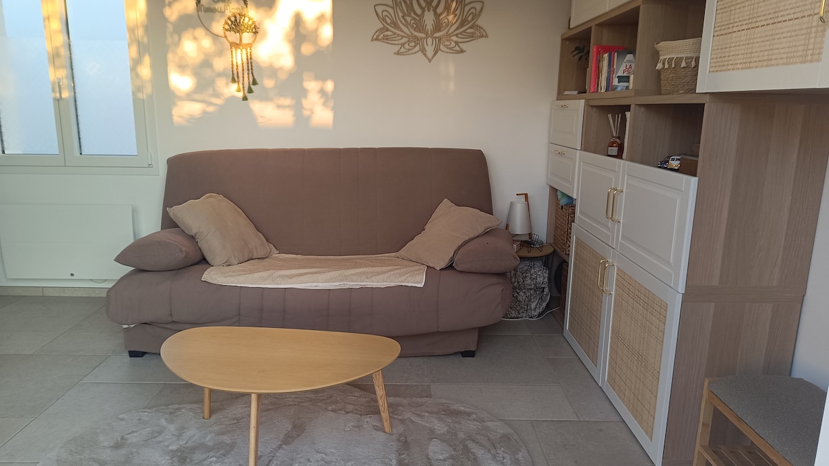 Liten lägenhet på 13 m2 utrustad med stort badrum och privat toalett, i anslutning till vårt hus. oberoende tillgång till liten innergård med bord och trädgårdsstolar. belägen 5 minuter från centrum, stormarknad, apotek, alla butiker. Lac de Frace ligger 2 km bort. 20 km från La Rochelle, 15 km från Chatelaillon, 20 km från Rochefort, 50 km från Ile de Ré. Djur är inte tillåtna. Boendet måste lämnas rent av hyresgästen, tack.