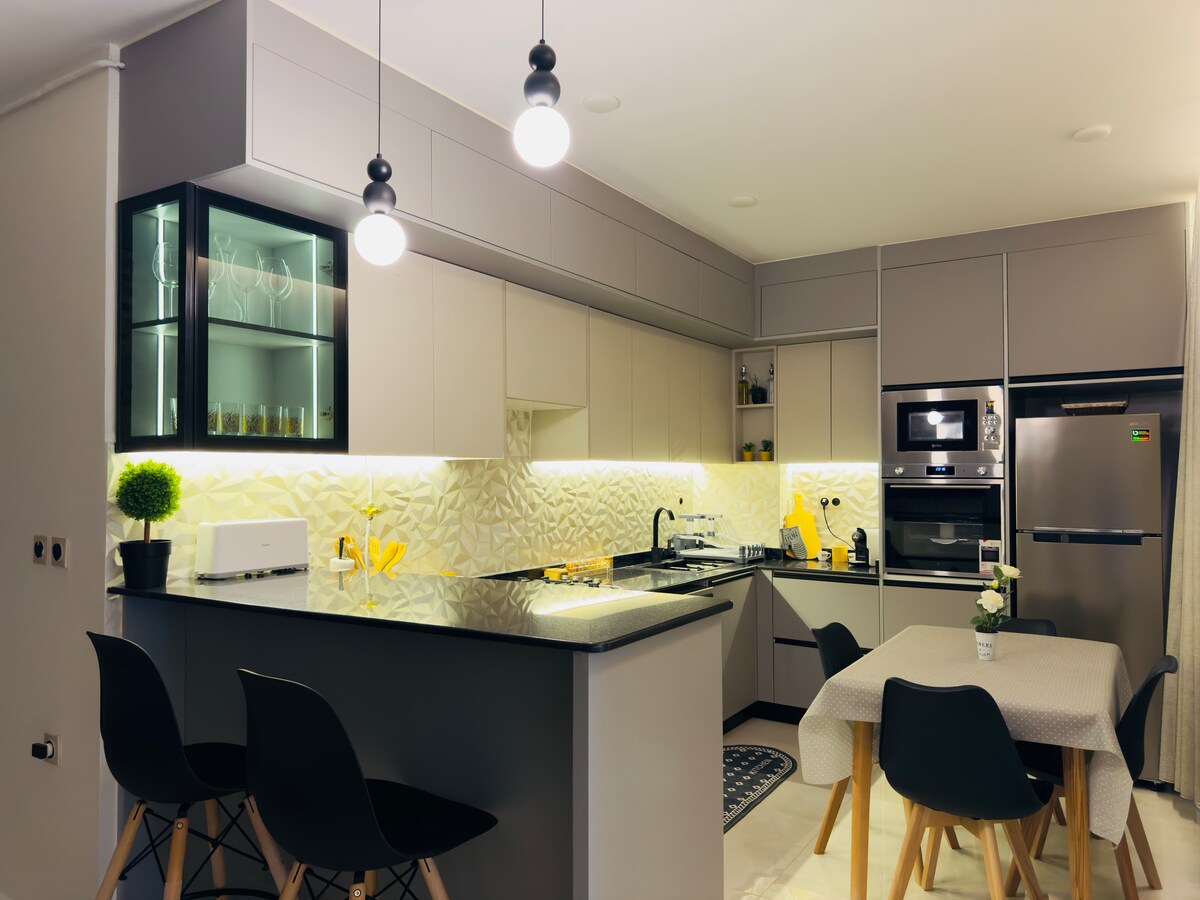 Vacker lägenhet med panoramautsikt över havet, perfekt för en avkopplande vistelse som kombinerar komfort och elegans. Denna rymliga och ljusa lägenhet består av: 2 stora bekväma sovrum 1 dubbelsäng 1 dubbelsäng (180 cm) Ett stort vardagsrum med 180 graders havsutsikt, badat i naturligt ljus Ett fullt utrustat modernt amerikanskt kök Ett badrum med duschkabin Säker privat parkering i källaren, säkerhetsvakt dygnet runt, övervakningskamera, kontrollerad åtkomst via fjärrkontroll