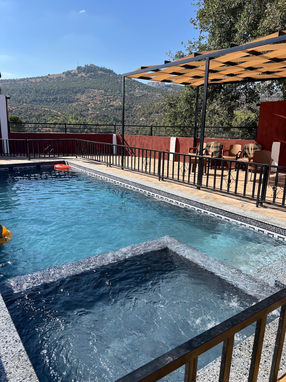 Håll dig lugn och koppla av med din familj på detta tysta ställe. 💧 Simbassäng för vuxna storlek 10*5🏊 💧Poolen är helt stängd (barnskydd) 💧Fullt skuggad pool 🌊 💧Panoramautsikt över poolen från loungen (hemlig dörr) Utomhus💧sessioner 💧 4*4 vattenfall med en lugn sittplats 💧Fullständig integritet 💧Den har en fantastisk utsikt 🌲 💧Rymliga områden och sittplatser