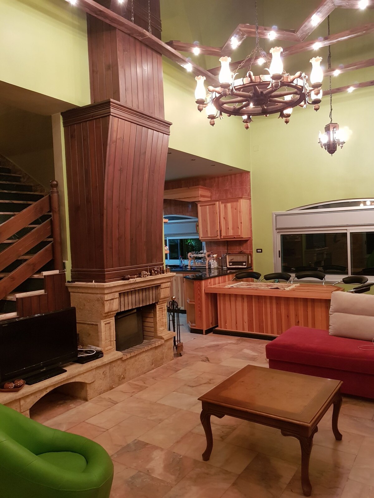 Tre nivÄer. Toppen Àr tre master ensuite master sovrum. mitten Àr 100 m2 panoramautsikt rum med badrum, kök, matbord, öppen spis, vedspis vÀrmare, kylskÄp, bordtennis, dart, TV och satellitmottagare, tvÄ sittplatser. Huset har miljövÀnlig ström: vind och sol. Har solvÀrmare och regnvattentank.