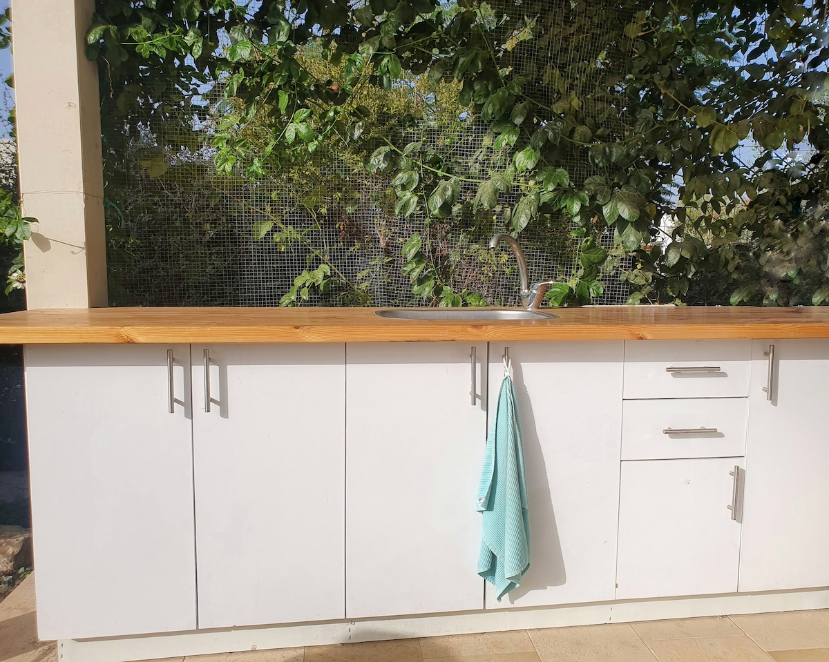 Denna 1BR bungalow är den enklaste bostaden på vår Jerash Hills Farm Det rymmer en familj på 2 vuxna i sovrummet och 2 barn på bäddsoffan i loungen. Bungalowen har ett sovrum, ett litet badrum med duschkabin och en kokvrå med bar kylskåp, mikrovågsugn och en liten gasspis. Det finns en gas- och koleldad grillplats på den stora terrassen med utsikt över poolen. Det finns också en bakre terrass skuggad av en gigantisk ek och en privat lekplats för barn.