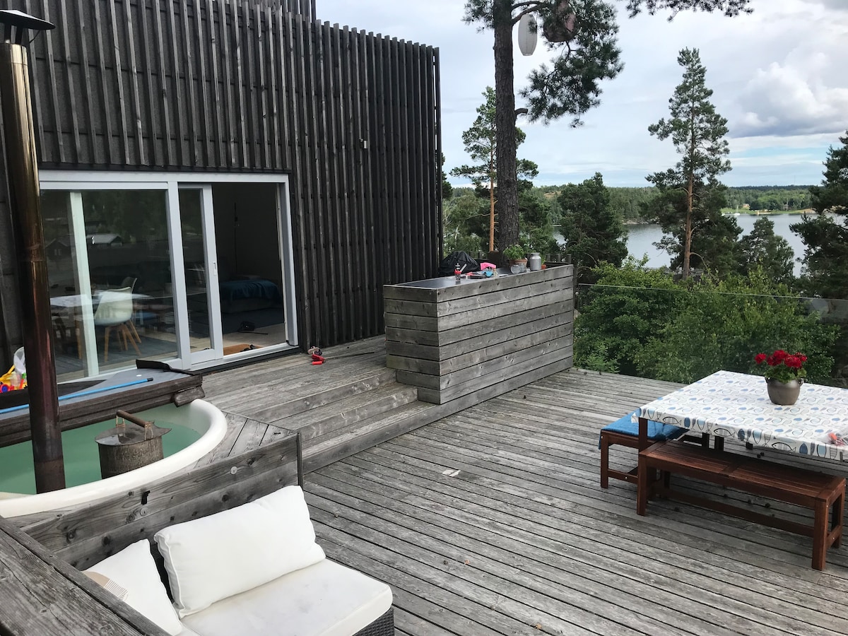 Hitta lugnet och möt äventyret i detta nybyggda trähus ca 1,5 timmar från Stockholm City. Huset andas kärlek till naturen och ligger på en lugn ö i Stockholms skärgård som mestadels består av naturreservat. Här finns inga bilar eller oljud utan bara vilda bär och vilda djur. Nära till havet, den egna bryggan (se bild) ligger ca 100 meter från huset. Tillgång till vedugn, vedeldad bastu, 2 Havskajaker (K1) och 4st Cyklar (Allt ingår i hyran).