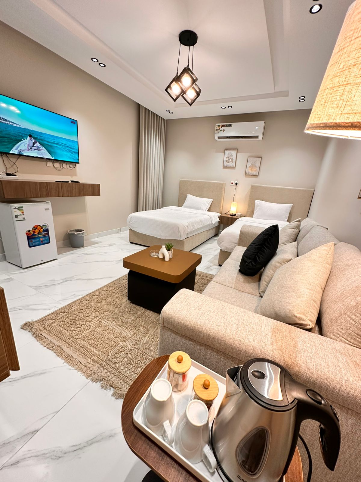 نوفر لك إقامة فريدة وراقية يتم فيها توفير جميع وسائل الراحة التي تستحقها، ونقوم هنا بتوفير وسائل الترفية من اشتراكات Netflix وShahid ، كما تحصل هنا على الخصوصية التامة وتسجيل الدخول الذاتي، في موقع مميز وقريب من جميع الاماكن السياحية والخدمية.