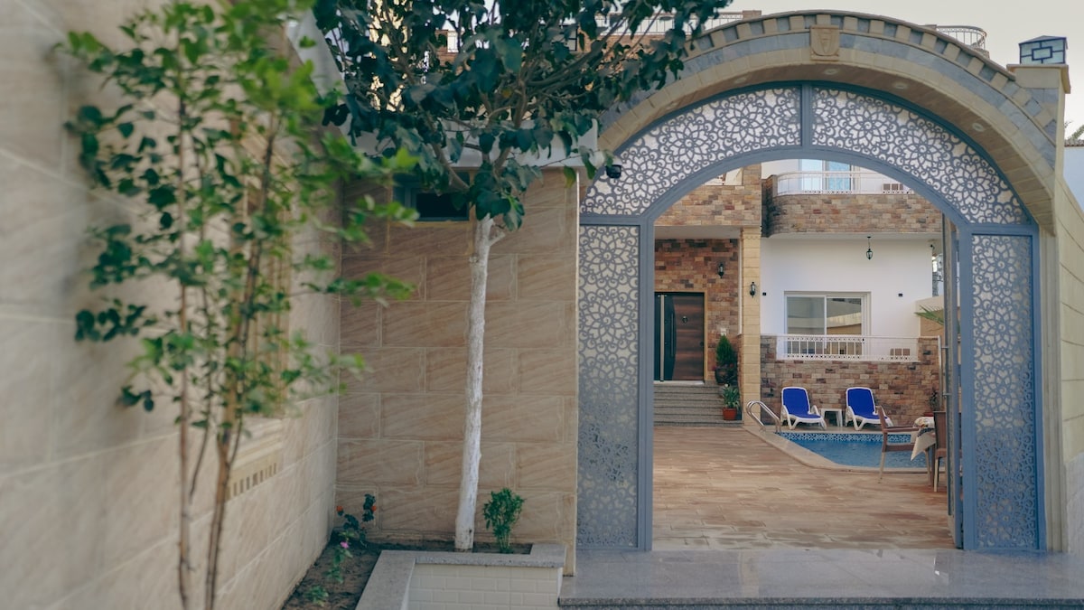 Upplev raffinerad lyx i vår privata femstjärniga villa, utformad i elegant arabisk islamisk stil – ett sant levande konstverk. Njut av en privat pool och jacuzzi, luftkonditionerade rum, ett fullt kök och 3 badrum. Ett bordtennisbord, stjärnskådning med hjälp av ett stort teleskop, och varva ner i total avskildhet. 📍 ligger nära Konungarnas dal 🌍 Personliga turer tillgängliga 👥 Lämpligt för grupper upp till 11 gäster på begäran En unik blandning av komfort, kultur och konstnärlig skönhet i Luxor.