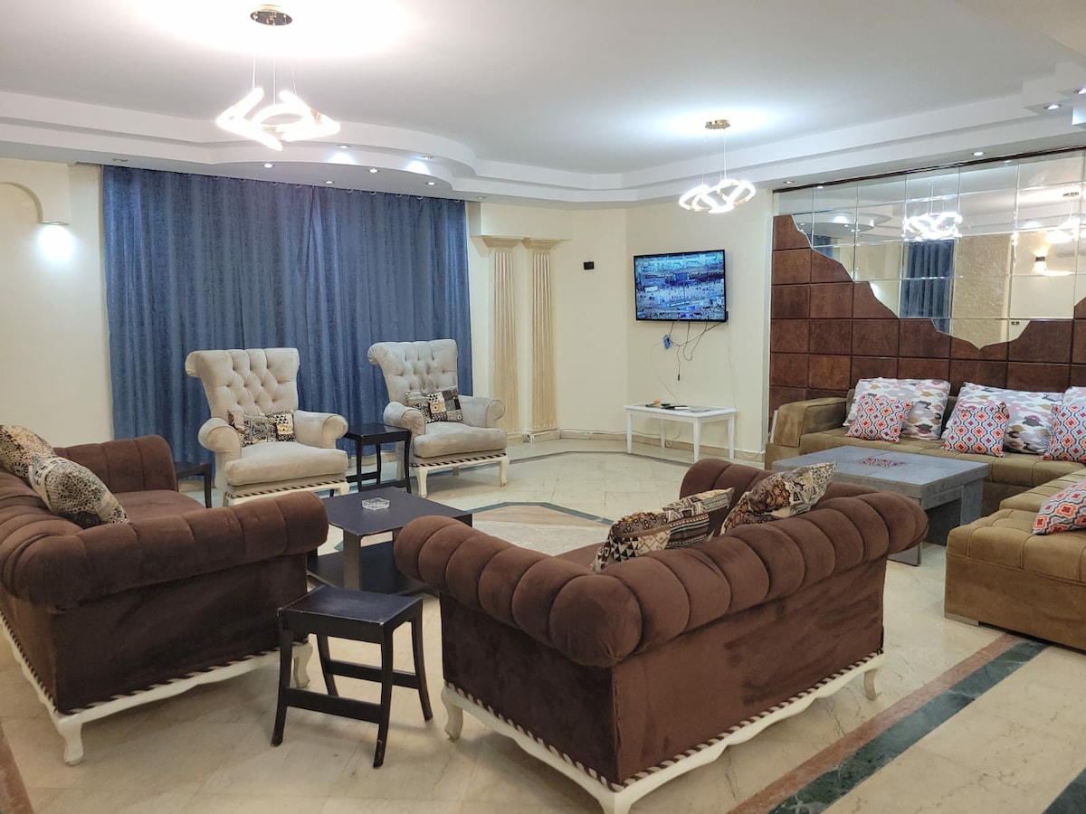Lägenheten är enorm, rymlig och ljus, perfekt för allt. Beläget bara en minut från Four Seasons Hotel och bara 3 minuters promenad från Kairo Zoo, erbjuder vårt Airbnb ett utmärkt läge precis vid Nilen i ett exceptionellt grannskap. Beläget i ett fantastiskt område, kommer du att befinna dig bekvämt nära alla dina väsentliga behov.