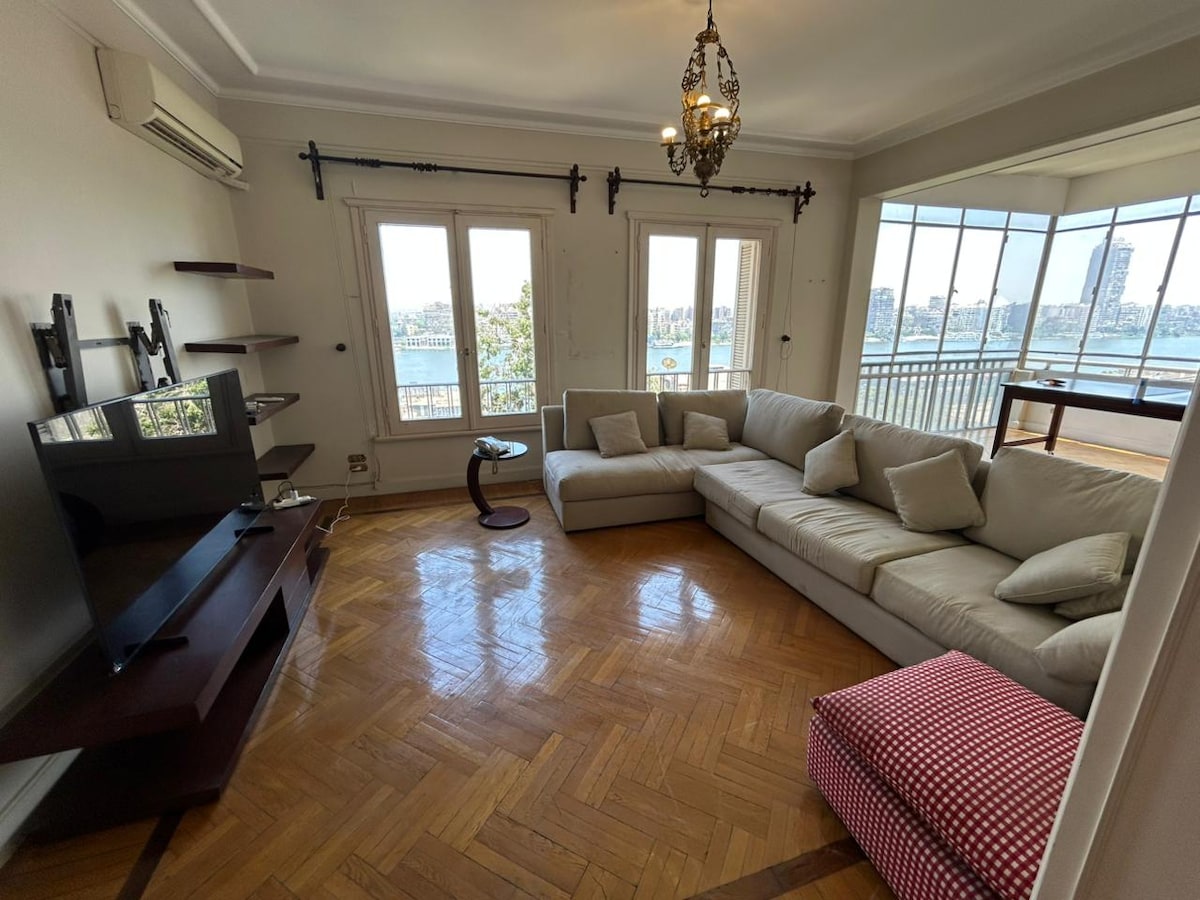Denna ljusa mysiga lägenhet garanterar den bästa utsikten någonsin framför Nilfloden där du kan koppla av och njuta av solnedgången i 127m med 3 sovrum ligger i historisk byggnad från 1900-talet i ett mycket säkert område med vänligt grannskap. platsen är bäst belägen till de flesta turistattraktioner och nattliv områden från 2-6 km till egyptiska museet, Kairo-tornet, Muhammad Ali-moskén , Kairo centrum ,Zamalek, Mohandessin , 1 min promenad till stormarknaden, tvätterier , restauranger , apotek