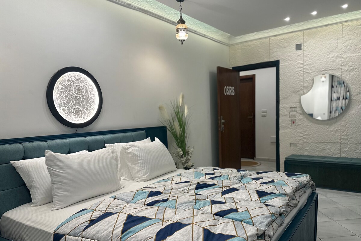 Bara 5 minuters promenad från ingången till den majestätiska pyramidsporten, ligger denna enhet i en nybyggd byggnad, inbäddad i ett autentiskt lokalt grannskap som andas livet och äktheten i Kairo, samtidigt som det garanterar en säker upplevelse. I detta autentiska hörn behåller de närliggande gatorna sin traditionella charm, även om de ännu inte har blivit asfalterade. Du kan hitta hästar och kameler på gatan