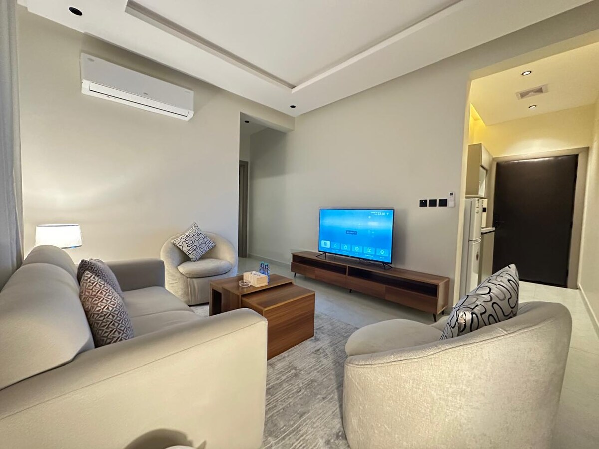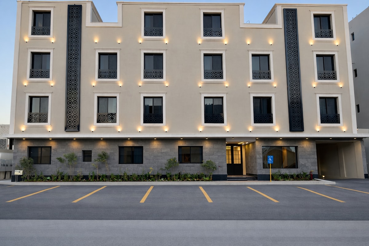 En lyxig lägenhet i Ard-distriktet norr om Riyadh, med ett strategiskt läge nära King Khalid International Airport (ca. 23 km), bara 8 km från Al Habib Hospital, och 15 minuter från Boulevard. Med ett sovrum och en lounge med ett dedikerat matlagningutrymme och ett badrum, utformat med eleganta och bekväma möbler, erbjuder det en lugn och trevlig vistelse. Det har självincheckning för fullständig bekvämlighet och tillgänglighet, med gratis internet och smart-TV. Lägenheten är mycket ren, med helt nya redskap, belägen i en modern och helt ny byggnad, för att säkerställa en bekväm och säker vistelse för gästen.