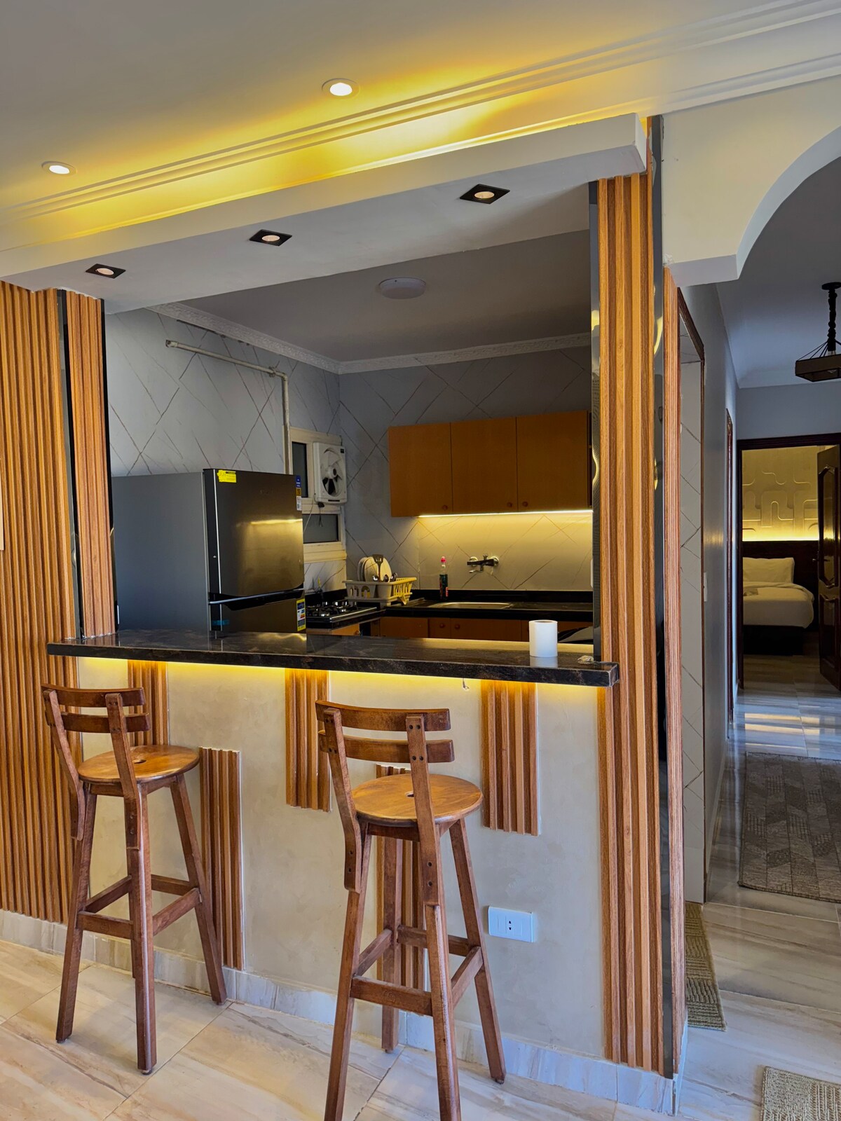 Upptäck en charmig boho-lägenhet i Giza, designad med lugna neutrala toner och naturliga detaljer. Den är idealisk för tre gäster och har en mysig dubbelsäng, en bäddsoffa, en matplats och en kokvrå för lätt matlagning. Koppla av med en privat jacuzzi eller håll dig aktiv med en minimal träningsutrustning. Denna fridfulla tillflyktsort ligger nära de ikoniska pyramiderna och erbjuder den perfekta blandningen av komfort och kultur, vilket gör den till en idealisk bas för ditt egyptiska äventyr.