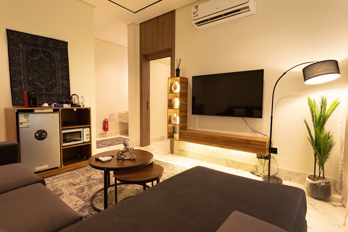En elegant och fullt utrustad studio i ett utmärkt läge i Al Khobar, med en modern design perfekt för resenärer, turister och affärsgäster. 📍 Bekvämt beläget nära: 🛣️ King Fahd Causeway – 5 min 🛍️ Ajdan Walk – 12 min 🌊 Corniche – 9 min 🏝️ Half Moon Bay – 20 min ✈️ King Fahd flygplats – 35 min 🏭 Aramco Gate – 18 min Funktioner i ✨ studiolägenhet: 🅿️ privat parkering 🔑 Smart entré 🛏️ Dubbelsäng 📺 65" smart-tv ☕️ Kaffehörna 🔌 Kylskåp 🛜 Internet. 🧺 Fräscha sängkläder efter varje vistelse
