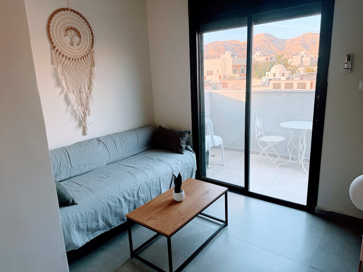 Ditt hem hemifrån väntar på dig här. Mysigt och bekvämt för ditt besök i Aqaba Röda havet med en super-king size säng och en avkopplande privat balkong med bergs- och havsutsikt, vi ses snart. Läge: *Aqabas flygplats: 8 kilometer * Köpcentrum i centrum: 10 kilometer *Närmaste strand (allmän tillgång/betalda resorter): 10 kilometer *South Beach, Diving & Snorkeling Site: 17 kilometer *Marknad, Apotek, Bageri, Takeaway Mat, Livsmedel: 300 meter