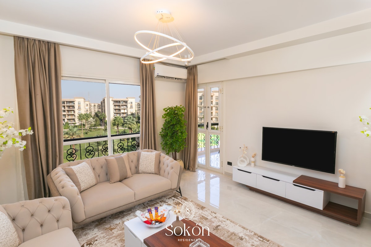Elegant boho-lägenhet med 2 sovrum på ett lugnt, avkopplande ställe med utsikt över en stor trädgård – perfekt för en lugn och bekväm vistelse. Njut av 3 smarta TV-apparater: två 65-tumsskärmar (vardagsrum och huvudsovrum) och en 50-tums-TV i det andra sovrummet – alla med streamingtjänster inkluderade. Dessutom supersnabbt, pålitligt Wi-Fi, perfekt för distansarbete eller filmkvällar. Utmärkt läge bara några minuter från Gateway Mall, med kaféer, restauranger och shopping i närheten inom El Rehab i Nya Kairo.