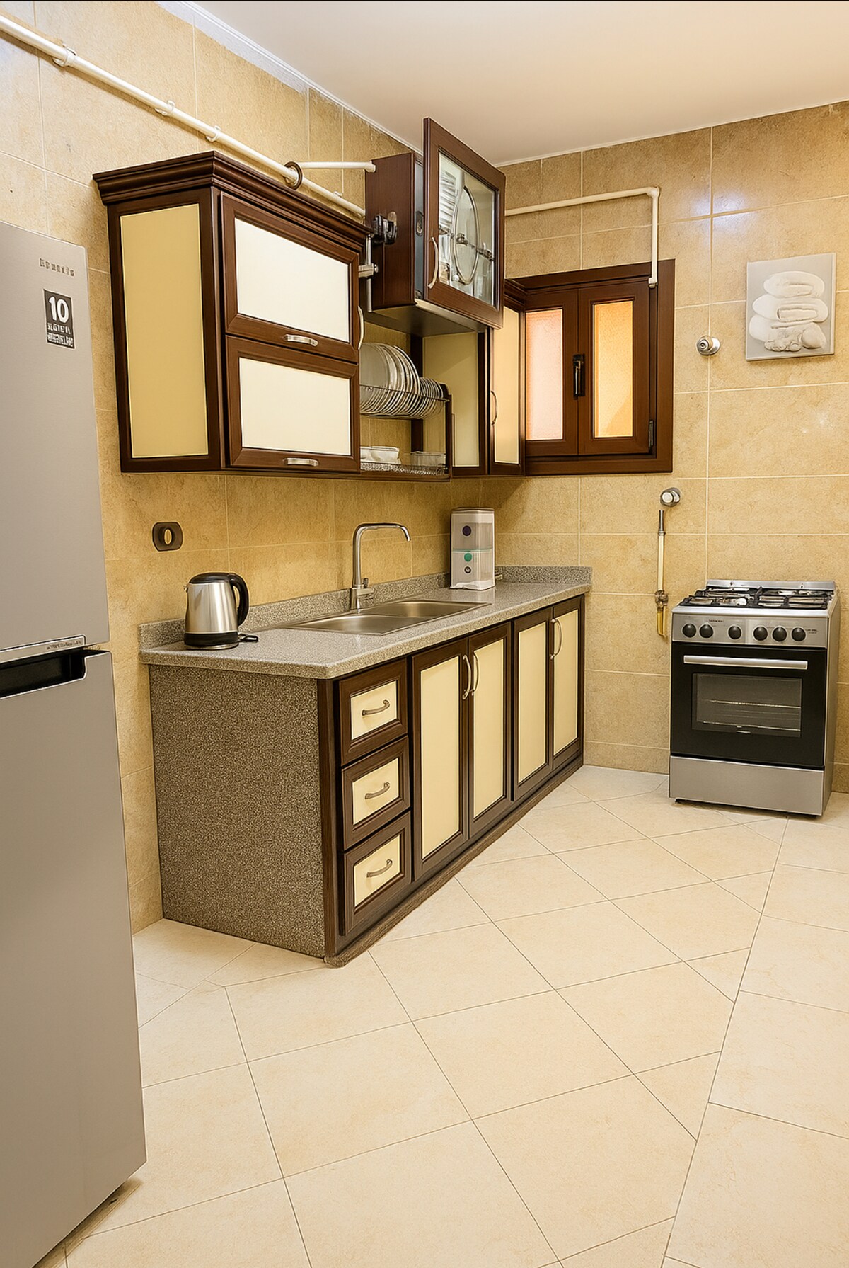 Välkommen till vår fridfulla trädgårdslägenhet på bottenvåningen i Alburouj Compound. Med två bekväma sovrum, moderna badrum och ett stort vardagsrum med öppen planlösning är vår lägenhet perfekt för avkoppling. Njut av matlagning i det fullt utrustade öppna köket eller koppla av i den privata trädgården. Med höghastighets Wi-Fi, luftkonditionering i varje rum och närhet till lokala bekvämligheter erbjuder vår eleganta tillflyktsort den perfekta blandningen av lugn lugn och bekvämlighet.