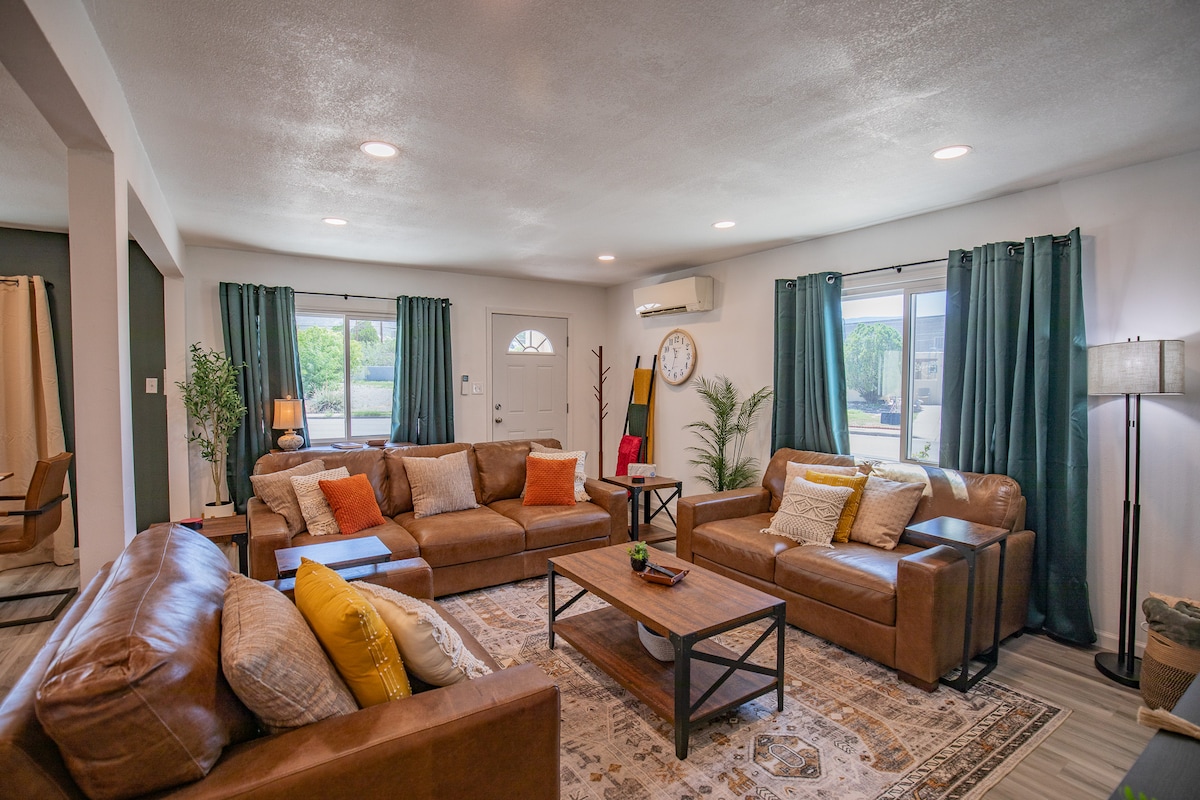 Centralt beläget 4br/2bth hem i ett lugnt grannskap för din grupp eller familj; koppla av i ditt val av 2 king eller 2 queen sängar. Samlas i spelrummet med pokerbord, 55" smart-TV, head-to-head videospelbord, elgitarr och förstärkare, popcornmaskin, dryckeskylskåp, brädspel och komplett bar. Den öppna layouten gör att alla kan laga mat, äta eller titta på en film på 65-tums smart-TV tillsammans. Koppla av på den täckta uteplatsen med gardiner för skugga och sittplatser för alla, och en gasolgrill.
