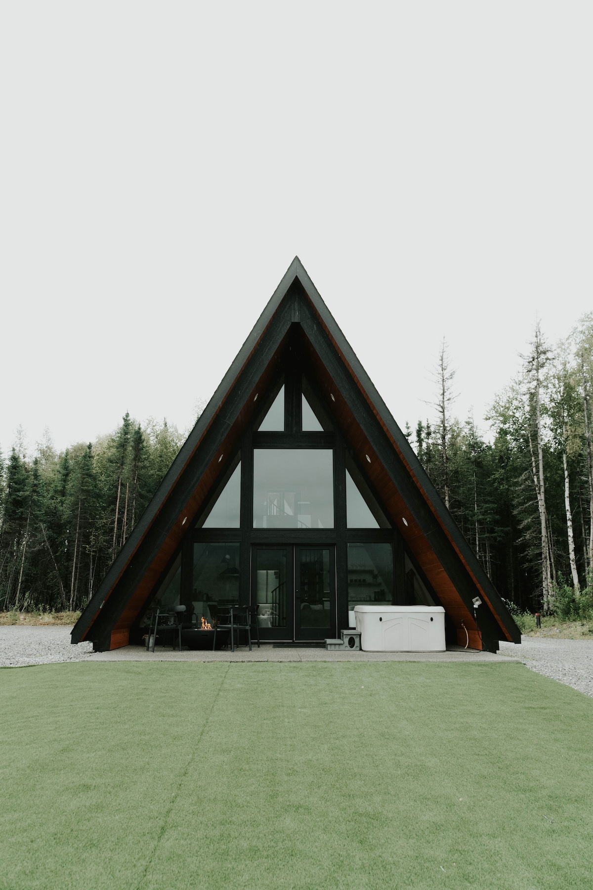 Modernt A-ramshus i Alaska utformat för en lugn återhämtning. Ljust, rent och avsiktligt minimalistiskt. Börja morgonen med kaffe vid fönstren, utforska närliggande vandringsleder och koppla sedan av i bubbelpoolen. Lugnt läge bara 1 timme från Anchorage och några minuter till stan. Perfekt för par eller en enkel semester. Letar du efter ett annat datum eller reser du med vänner? Vi har en andra stuga i närheten – du är välkommen att skicka ett meddelande till oss.