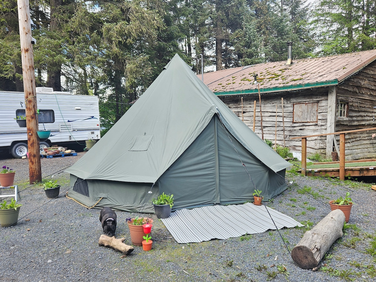 420-ansvarsfullt, vänligt och djurvänligt Du kommer inte att glömma den fridfulla omgivningen på denna rustika destination. Ditt boende kommer att vara ett coolt canvas-tält. Dubbelsäng och två enkelsängar. Lakan och kuddar tillhandahålls. Porta potty finns på plats. Ingen dusch eller tvättmöjligheter finns tillgänglig på plats. Seward har offentliga duschar. Grill finns tillgänglig, ta med eget kol eller kolla om någon har lämnat kvar något.