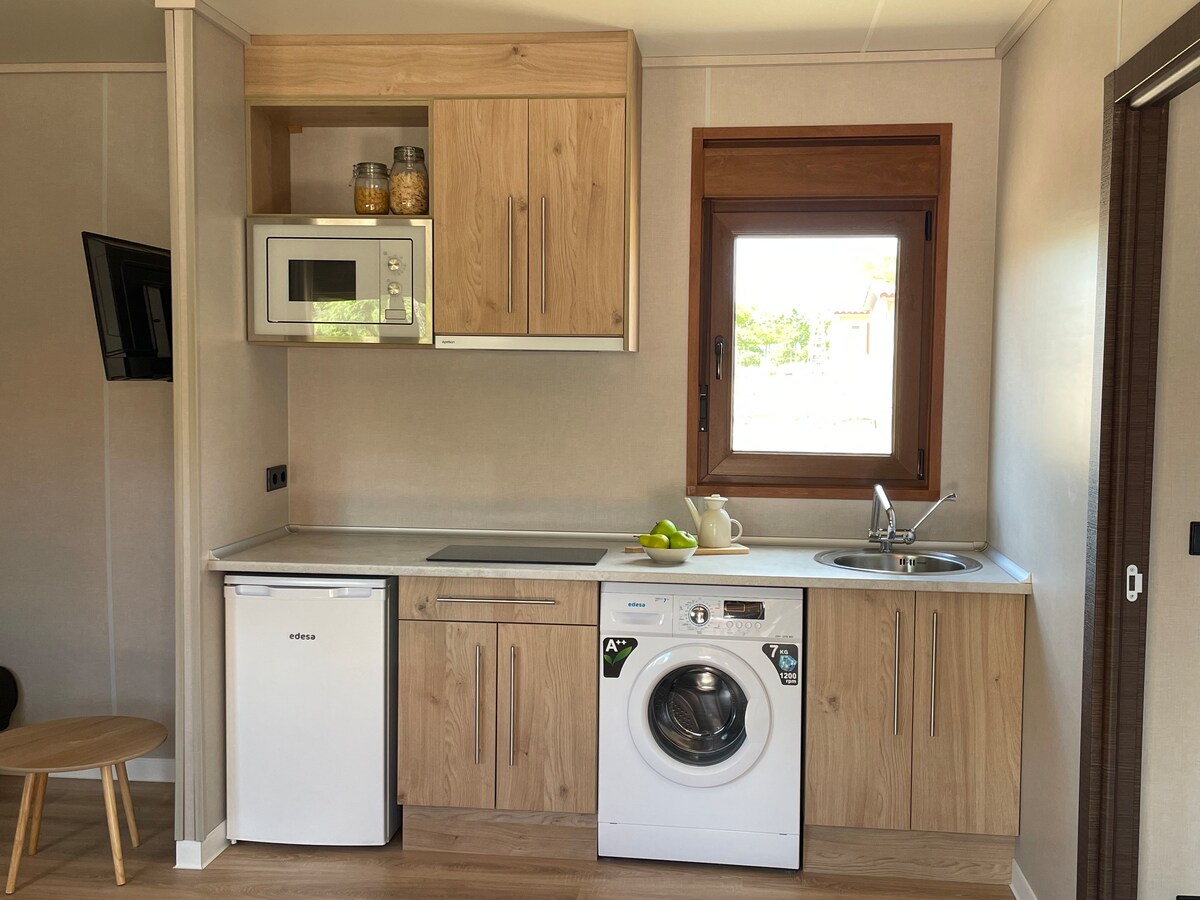 Lyxig villa på 54 kvadratmeter med ett sovrum med en dubbelsäng och en annan med två 90 cm enkelsängar. Det erbjuder en rymlig matplats med ett öppet kök fullt utrustat med alla nödvändiga köksredskap, ett matbord, LED-TV och luftkonditionering i alla rum. Villan har ett komplett badrum med en stor dusch. . Den har också en privat täckt terrass på 10 m²bekvämligheter inkluderar badrockar, naturliga toalettartiklar, en kapsel kaffebryggare och en vinkylare.
