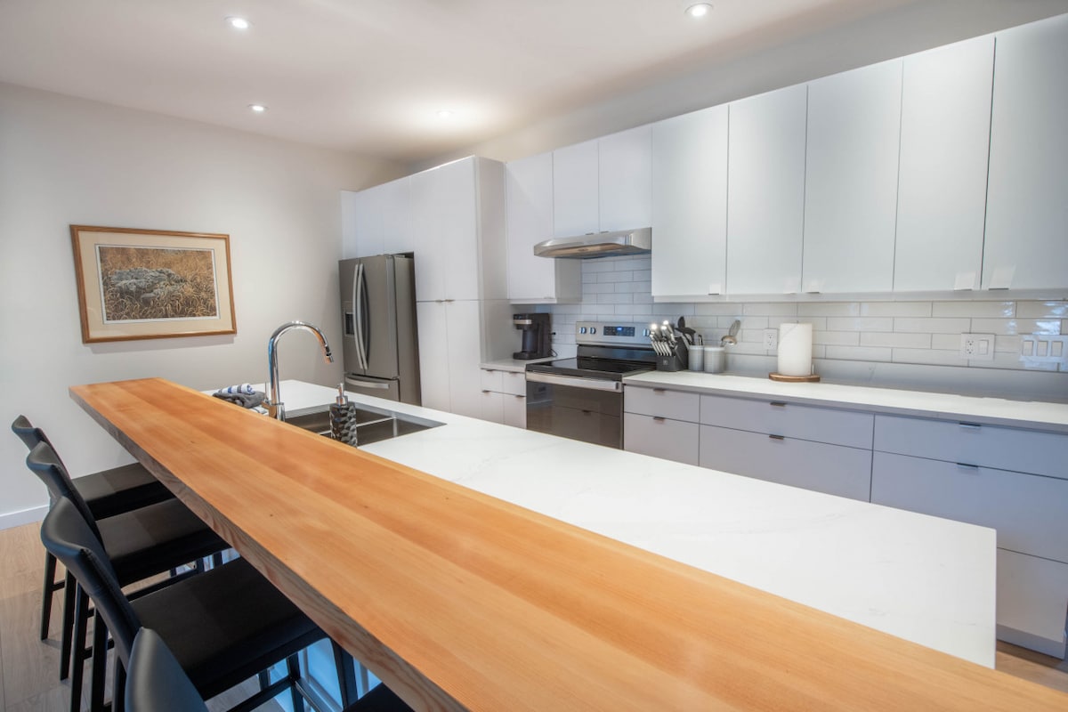 Three Peaks är ett nytt 1500 kvadratmeter stort tvårumshus beläget i hjärtat av Tofino med spektakulär utsikt över hamnen, Lemmens Inlet och Coastal Mountain Ranges. Detta boende ligger på en lugn cul-de-sac, inom gångavstånd till Tonquin Trail/Beach, och alla bekvämligheter i centrala Tofino inklusive restauranger och shopping. Huset är ljust och modernt och lämpar sig för middagar, avkoppling efter en lång dag av surfing eller chilling med familjen.