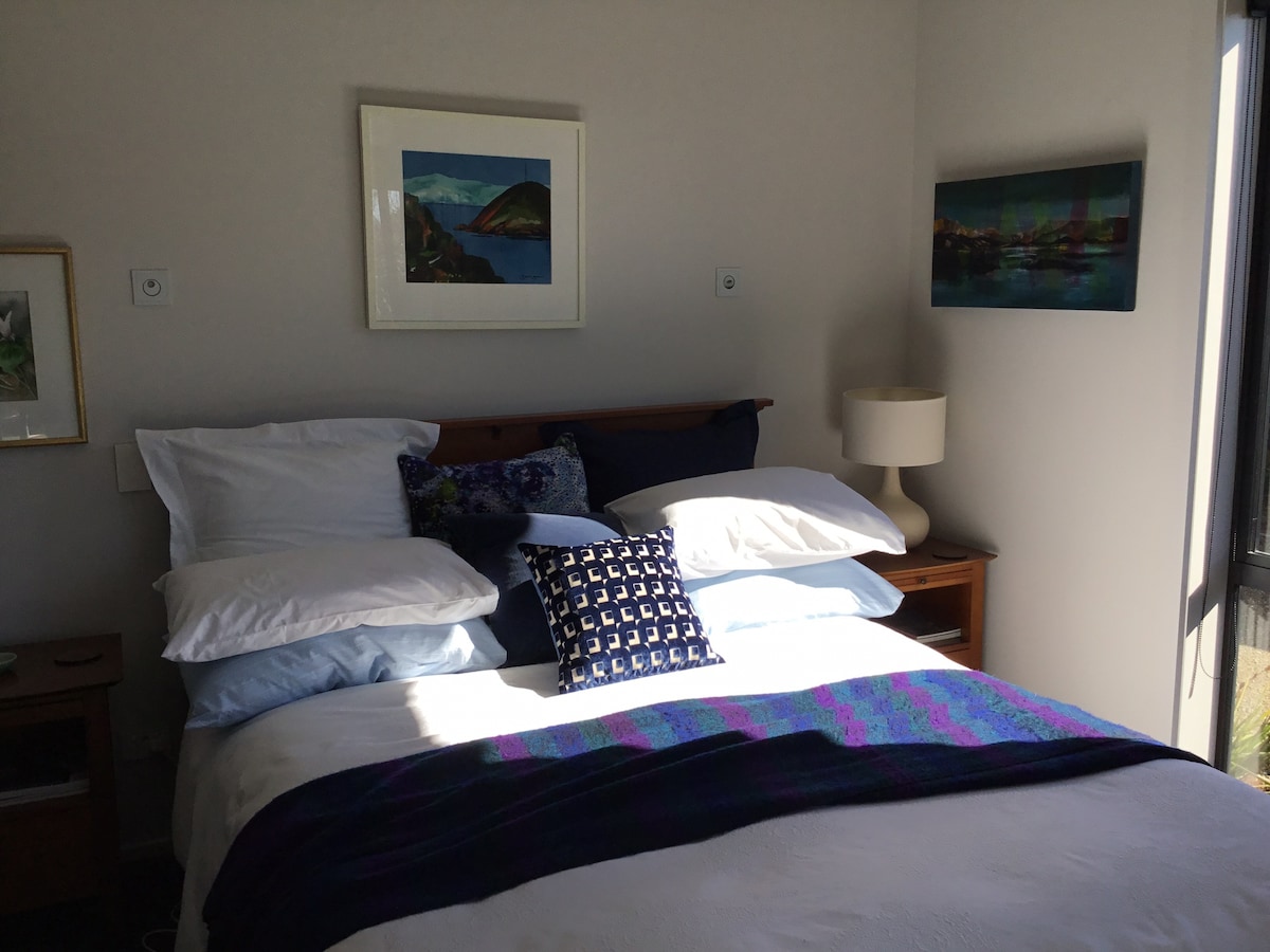 Denna eleganta 1-bäddsenhet är perfekt för resenärer. Det har vacker morgon till mitt på eftermiddagen. Beläget på 1 hektar, 3 km från Wanaka sjön. Privat inhägnad innergård inklusive grill, utebord och stolar. Pentry med kylskåp, diskbänk, mikro, elektrisk stekpanna och kaffebryggare. Matbord, lädersoffa, smart TV, värmepump. Dubbelsäng. Badrum med toalett, dusch, uppvärmd handdukstork, fläktvärmare, hårtork. Ägarens separata hus 30 m från BnB och har en 4-årig honpudel.