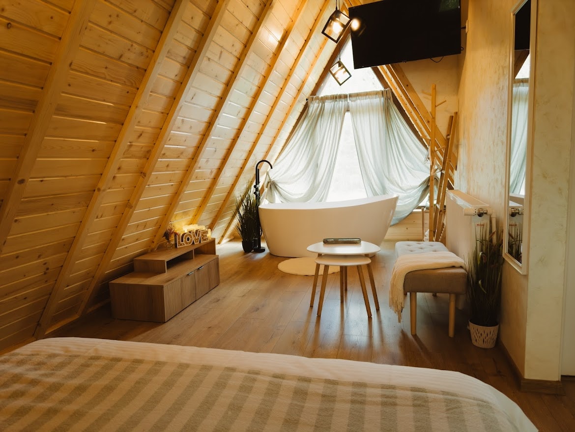 Koppla ur och varva ner i denna unika bungalow mitt i naturen och upplev livsstilen inomhus och utomhus. Njut av din privata terrass, utsikt över den gröna trädgården direkt från din säng och utomhuskök. Bungalowen ligger på en lugn familjeegendom och erbjuder rustik integritet och modern komfort — perfekt för en romantisk semester eller en långsam resa. Tradition och enkelhet i ett ljust utrymme med element av massivt trä snidade av lokala hantverkare.