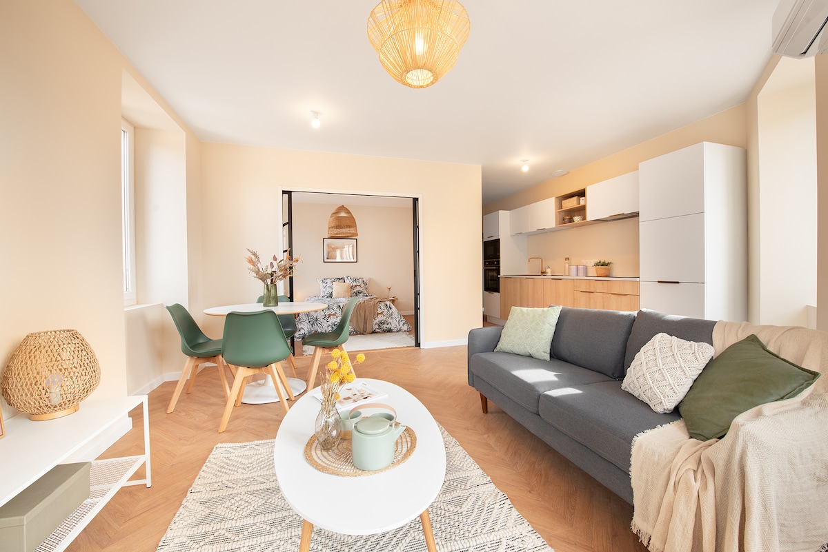 Varm och minimalistisk, kom och upptäck vår vackra nyrenoverade lägenhet med utsikt över klocktornet i katedralen, i en liten byggnad på andra våningen utan tillgång till hiss hiss. Endast för par, för familjer eller grupper av vänner, låt dig förföras för att upptäcka vår vackra stad Albi. Idealiskt beläget i centrum, ett stenkast från Place du Vigan, Cathedral, Toulouse Lautrec Museum, Palais de la Berbie och många andra platser att besöka.