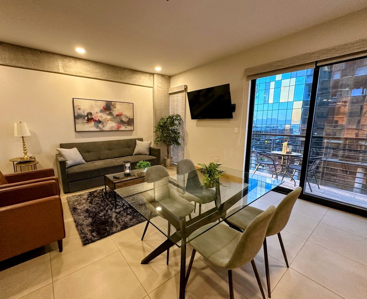 Upptäck ett oöverträffat utrymme i det mest exklusiva området i Chihuahua: Distrito 1. Detta lyxiga boende på åttonde våningen är perfekt för semester, arbete eller affärer och erbjuder avskildhet, komfort och en spektakulär utsikt. 🏙️ Designad för din komfort, du kommer att njuta av en pool🏊♀️, grillplatser, sociala lounger🎱, gym🏋️♀️, fullt utrustat kök🍳, Smart TV 📺och mycket mer. Allt du behöver för en perfekt vistelse. ✨