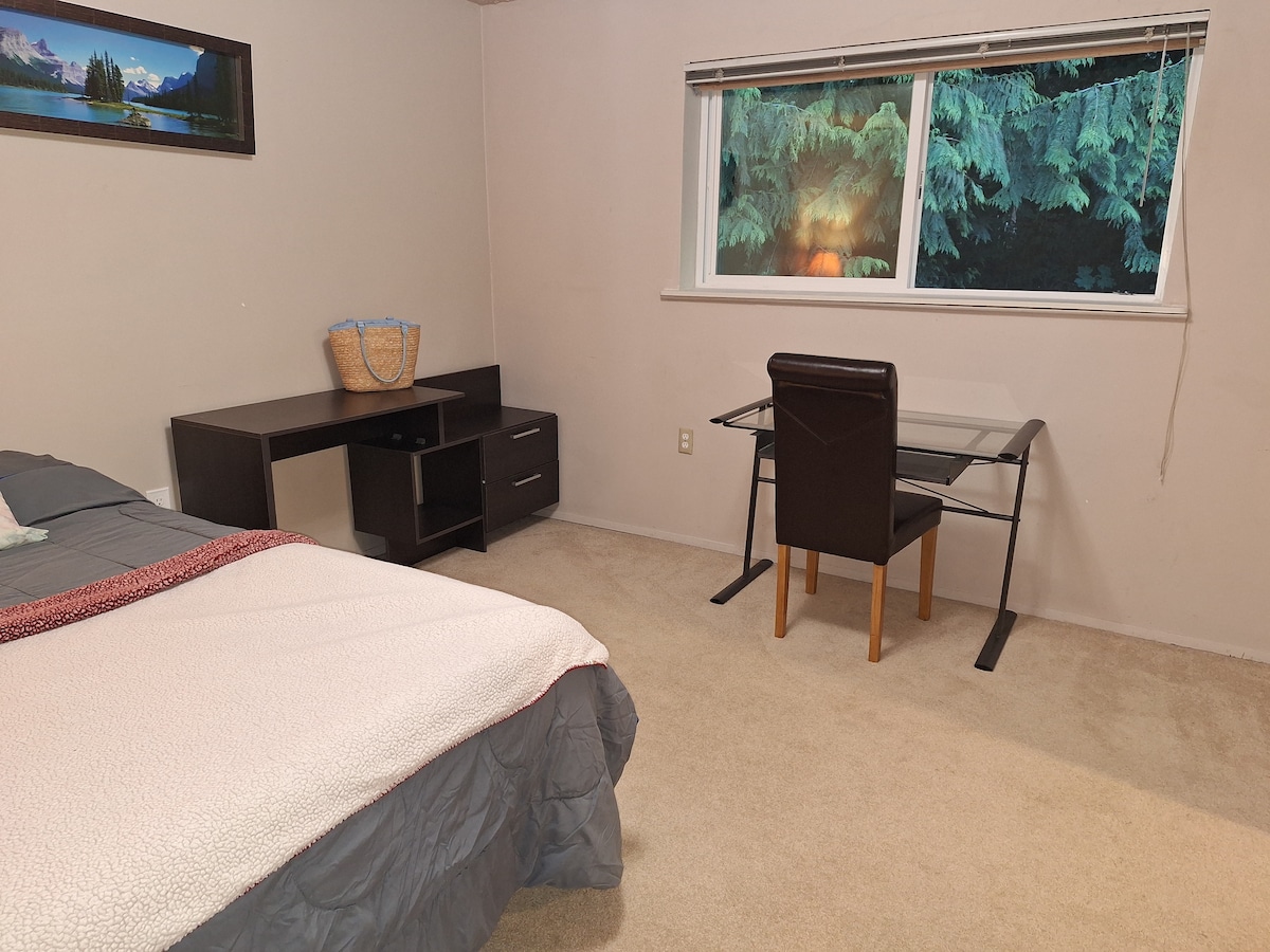 入住这间位于LYNNWOOD市中心附近的独栋住宅的B单元全层套房,享受便捷的设施。 客人可以独自享受整个封闭空间,这是一间位于楼下、带独立入口的私人住宅,客人有充分的隐私权,可以独占整个关空间. 设有独立的后院、并包括一间卧室、一间客厅和一间浴室。在您入住期间,没有别人打扰。 空间宽敞,营造出温馨舒适的氛围。是家庭和专业人士短期到中期停留的理想选择(无楼梯),最多可供3位客人入住。 它距离5号州际公路和405号州际高速公路仅两分钟车程,交通便利。无论您是出差还是长期停留,这里都是舒适、时尚和便利的完美结合。 房子坐落在一个安静的死胡同里,交通很少,保证了隐私和步行的便利。附近有几个购物中心,包括Alderwood 购物中心,韩国超市,当地图书馆,Costco,波音工厂参观中心和许多餐馆。 -这处房产有两层,客房位于后院的一楼。 -独立入口,独立空间 -客厅配有55英寸智能电视、4人餐桌、沙发床、冰箱、洗衣机和烘干机 -带一张大床的卧室 -功能齐全的浴室 -路边停车