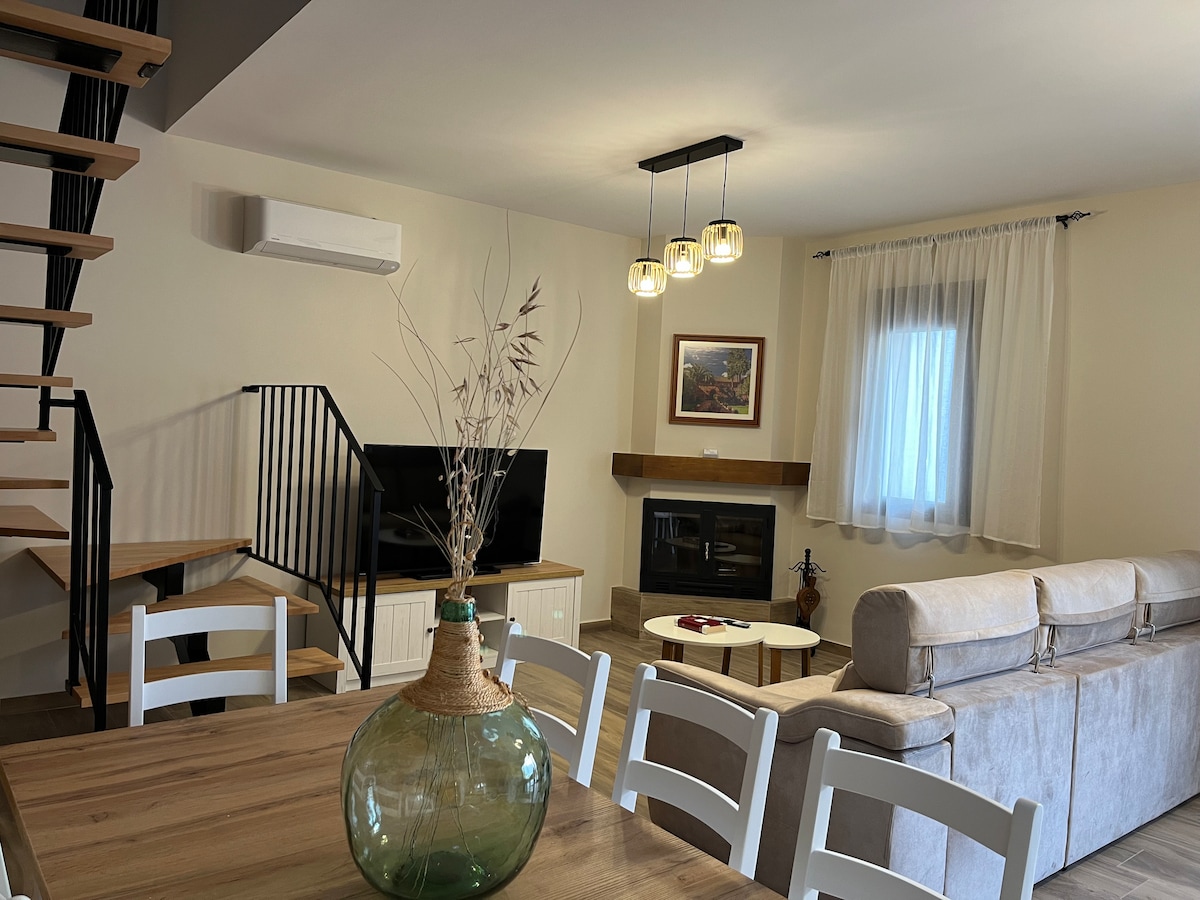 Uppsättning av 6 eleganta och bekväma parvilla-sviter, belägna i en miljövänlig miljö omgiven av olivlundar. Privilegierat läge, lugn, varm och familj behandling. Perfekt för romantisk semester och familjer med husdjur. Stora villor (90 m²) med kapacitet för 4 personer och baby. Består av vardagsrum, kök, upphöjt område öppet till vardagsrummet, 1 sovrum, 2 WC och privat uteplats med vattenfallsdusch och ergonomiskt badkar.