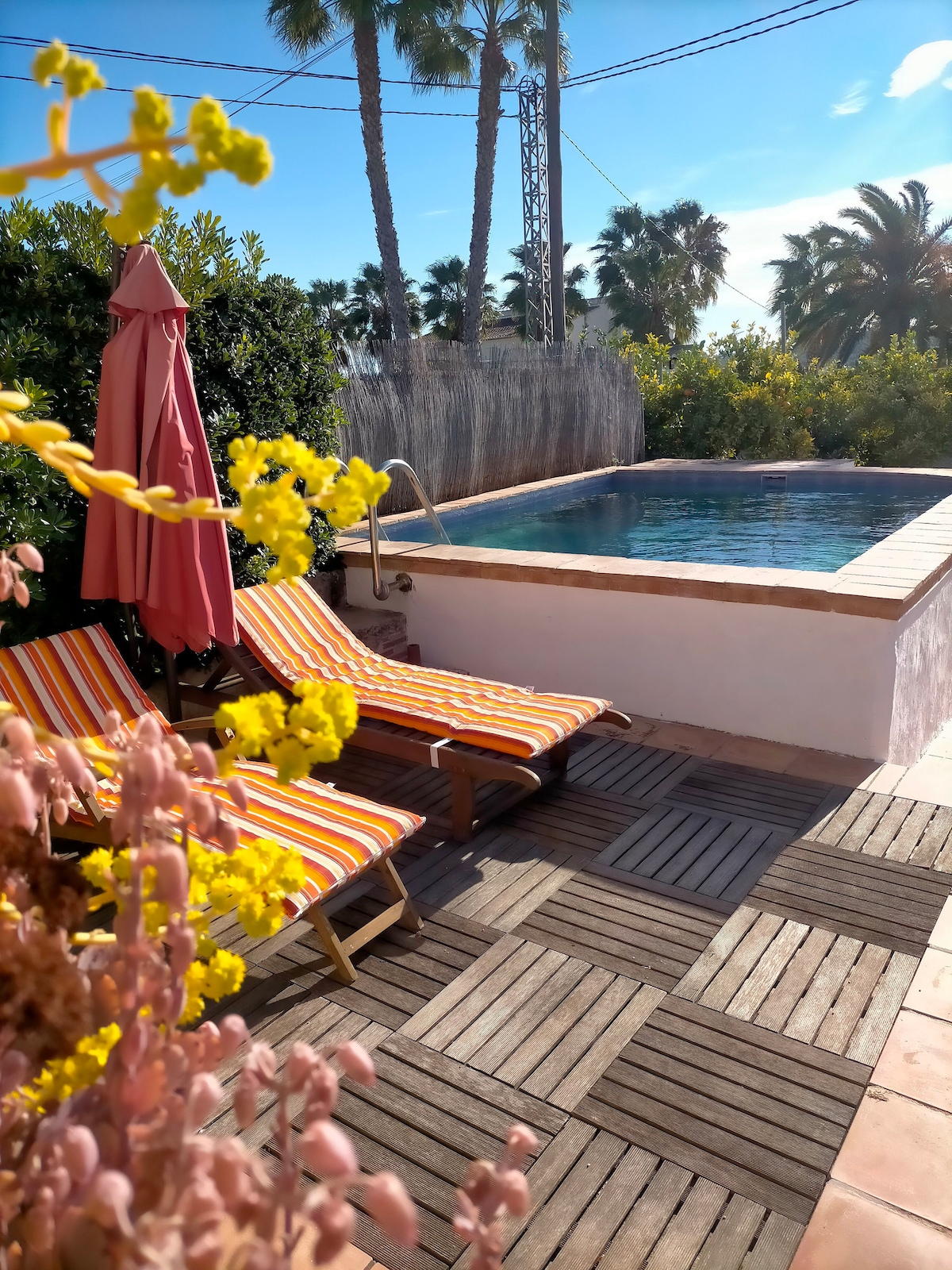 Koppla av i frodiga Meditarranean natur. Rymlig bottenvåning i villan, belägen på Javeas Montgo i tallarna och bara 7 minuter från Javeas gamla stad och hamn. Rymligt kök i öppen planlösning/matplats - vardagsrum med bäddsoffa för bekväm sovplats för 2, lyxigt badrum och separat sovrum med 2 sängar. Stor solterrass med solstolar och sittgrupp vid poolen (6X12 m). Du har exklusiv användning av trädgård, uteservering och pool under din vistelse.
