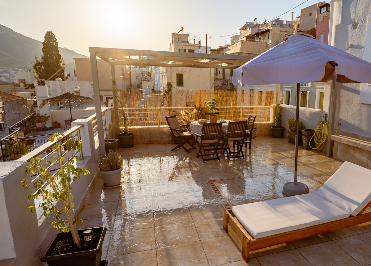 Välkommen till Your Island Retreat Kliv in i vårt välkomnande sommarhus i Myrties, Kalymnos – ett riktigt hem med 100 kvm traditionell grekisk värme och ljus. Högt i tak, stora dörrar och stora fönster låter solskenet flöda in i varje rum, medan nästan varje plats inuti ger dig vacker utsikt över Egeiska havet.