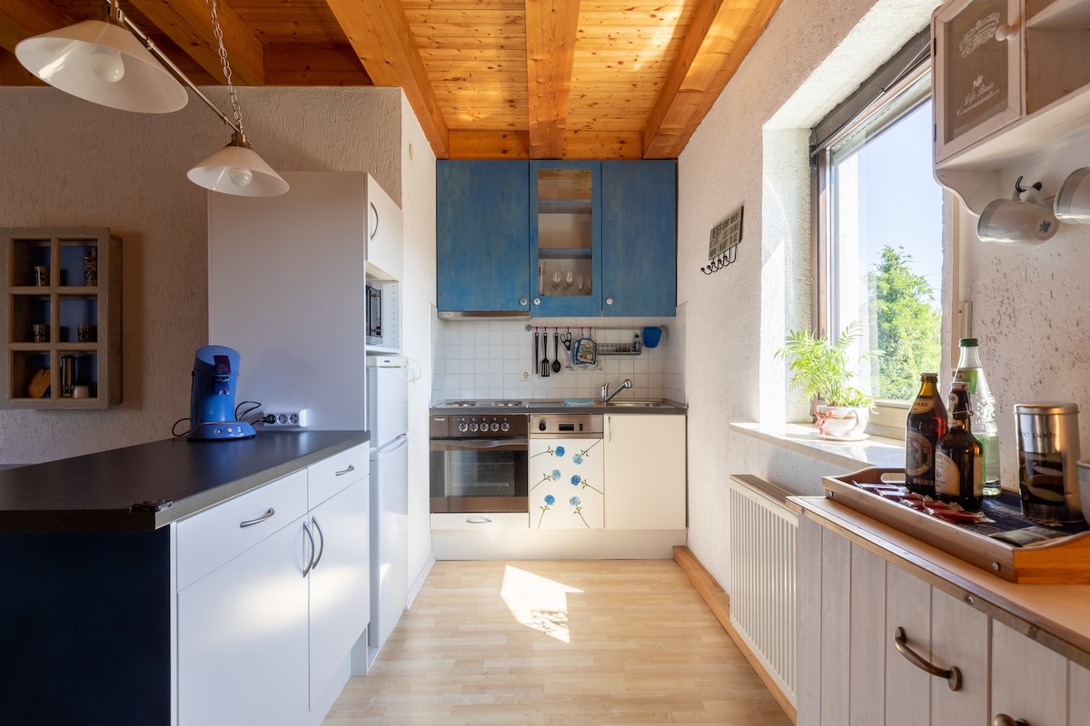 Vår moderna tvårumslägenhet erbjuder ett litet sovrum, ett vardagsrum med bäddsoffa, ett fullt utrustat kök, ett förråd, ett modernt badrum med regndusch och två soliga terrasser. Lägenheten har egen ingång via trädgården. Parkering är möjlig på den knappt trafikerade gatan. På grund av det lantliga läget rekommenderas en bil. München nås på ca. 35 minuter, bergen på 50 minuters bilresa.