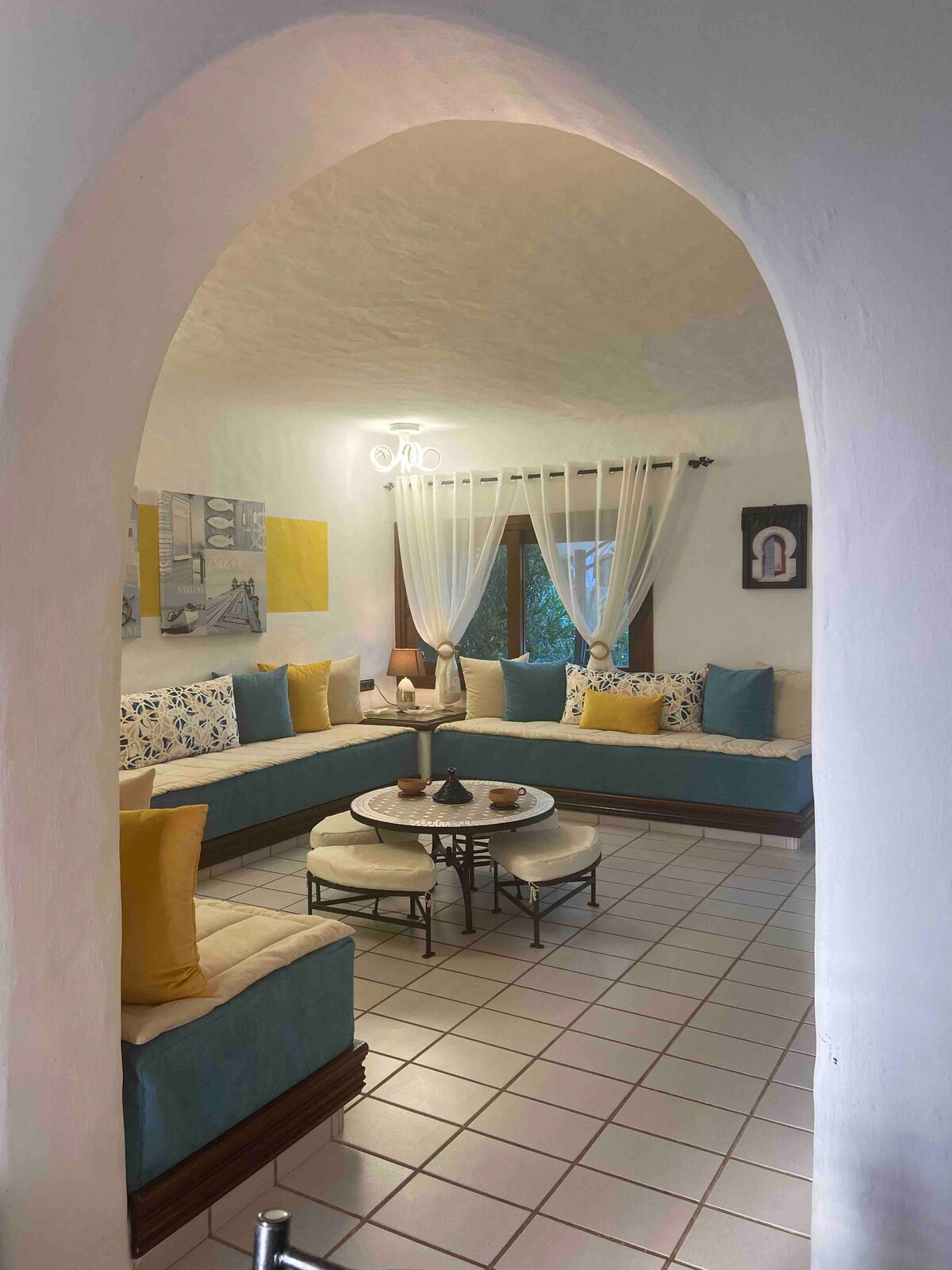 Lyxvilla med stor privat självrengörande pool 5 km från Cabo Negro och 3 km från Tétouan flygplats och McDonalds. Med 2 sovrum och 2 vardagsrum (ett med 4 bäddsoffor) för 8 vuxna, utrustat kök, modernt badrum, trädgård med belysning som tänds vid solnedgången, grillplats och parkering för 3 fordon. Garanterad rengöring och underhåll. Inga fester tillåtna, endast respektfulla gäster. Inkluderar automatisk luftkonditionering