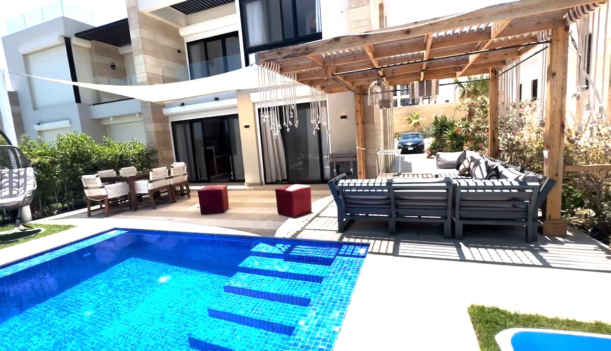 Välkommen! Detta mysiga och rymliga hus med fyra sovrum i Bay Homes, Almaza Bay är perfekt för gruppresor och familjer. Det erbjuder gratis tillgång till stranden, 20 minuters promenad bort. Det är också en 15 minuters promenad till byn med restauranger, barer, butiker och gemensamma centrum där golfbilar kan ta dig runt. Huset rymmer 8 gäster bekvämt och inkluderar en privat pool, en terrass, ett fullt utrustat kök, en grill och rullstolsåtkomst.