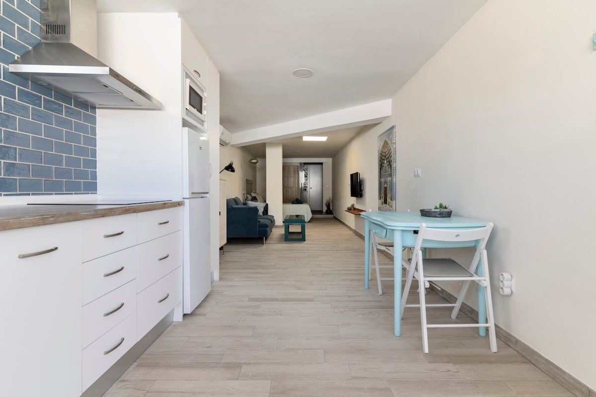 Vacker studio bredvid Almerias promenad 50 meter från stranden. Fullt utrustad, ny släppta möbler, perfekt för semester. Mycket ljust, i ett mycket lugnt område. Cafeterior, stormarknad och alla nödvändiga tjänster kan nås till fots. Hela lägenheten är nybyggd, nästan premiär. Tveka inte om du vill tillbringa några dagar med att koppla av i Almeria. Detta är din lägenhet.