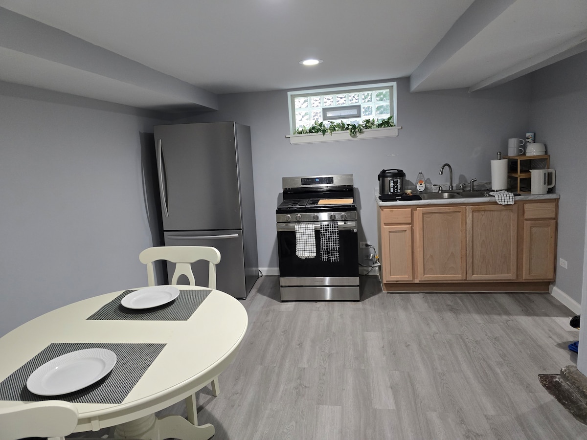 Gör dig hemmastadd i en charmig lägenhet med alla bekvämligheter! Förlora dig själv i fågelskådning eller läs en bok omgiven av frodiga trädgårdar. Ta en kort promenad till centrala Homewood för att njuta av shopping och middag eller ta tåget till Chicago. 🏳️🌈 BLM Säkert utrymme! Efter en dags utforskning kommer en king size-säng och ett frodigt badrum att skämma bort dig! En nedfällbar soffa skapar en extra säng. Hundar välkomna! Denna svit har en kokvrå med en konvektionstång och induktionshäll.