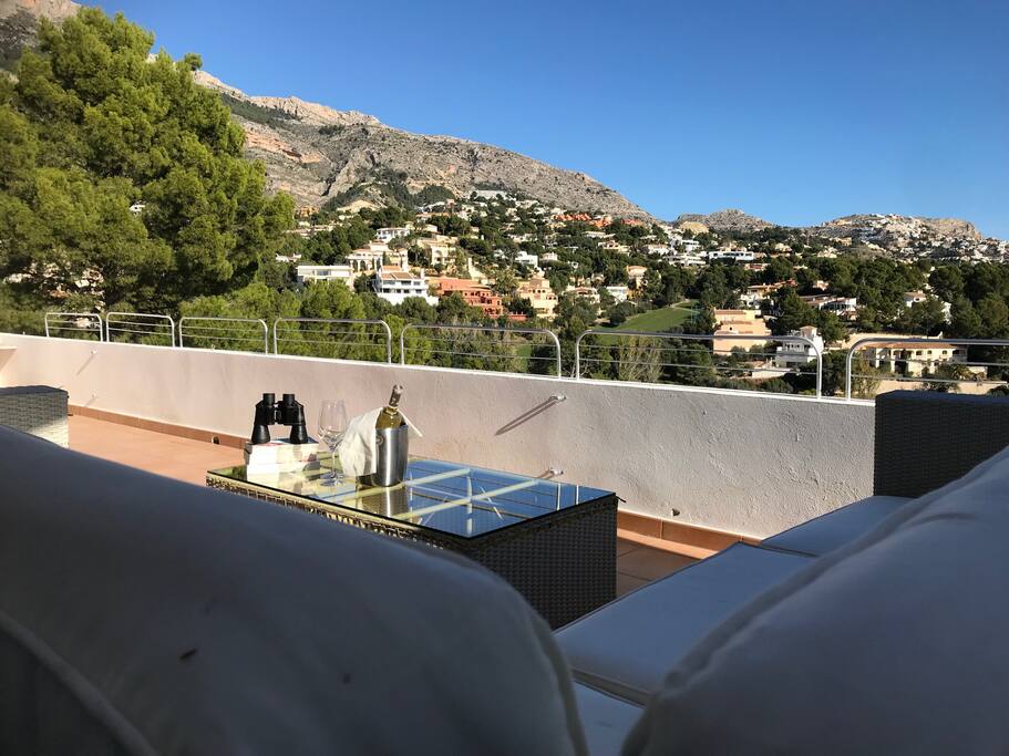 Direkt beläget vid golfbanan Don Cayo i Altea, nära ingången, och med vacker utsikt, modern renoverad, ljus och mysig lägenhet lämplig för 2. Lägenheten har ett stort sovrum med samma utsikt som från vardagsrummet och terrance, och ett badrum ensuite. Det finns ett andra rum för förvaring av golfklubbar, resväskor, etc. Det finns luftkonditionering (även för uppvärmning) och en gemensam pool.